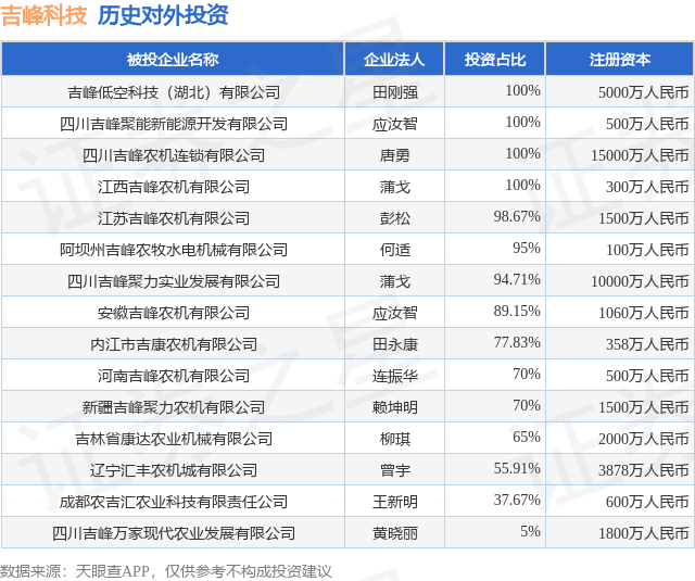 本站消息,根据天眼查APP显示,吉峰科技(300022.SZ)新增一起对外投资事件,被投资公司为吉峰低空科技(湖北)有限公司,法定代表人田刚强天创网 ,投资占比为100%。该公司从事科技推广和应用服务业,注册资本为5000万人民币。目前,吉峰科技共存在对外投资15项,详见下表: