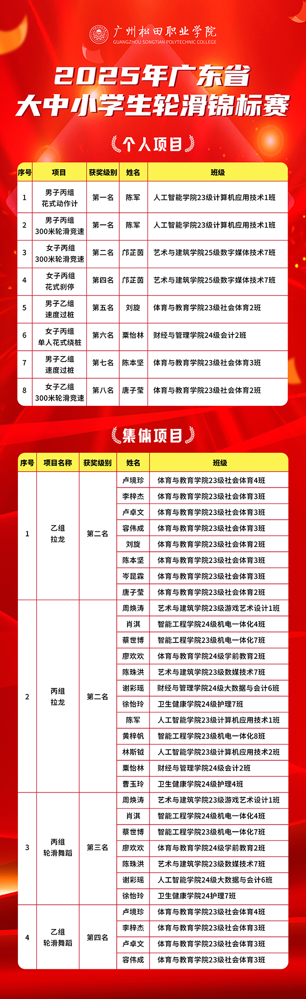 10月24日至26日,由广东省教育厅主办的2025年广东省大中小学生轮滑锦标赛在广东机电职业技术学院(北校区)圆满举行。本次比赛是广东省规格最高、规模最大、影响力最广的校园轮滑官方赛事,吸引了全省60余所高校近1300人参加。广州松田职业学院轮滑队不畏强手,奋勇争先,斩获2金3银1铜德邦国际,以及丙组团体总分斩获第3名、乙组团体总分第6名的佳绩!